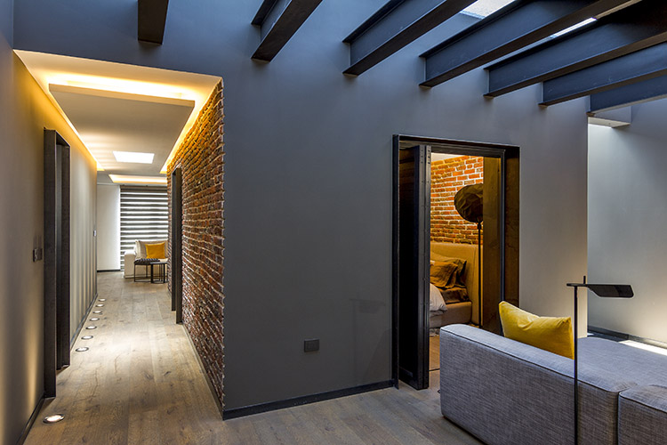 Los espacios destinados a lo individual no pierden la línea sobria con toques inesperados. Confortable, lujoso y divertido siguen siendo las notas que predominan en el dormitorio y el baño. El estilo industrial se hace presente con los muros de ladrillo y las estructuras de acero. Los contrastes se crean a partir de la materialidad; de las transparencias inusuales de la reja que divide el dormitorio y el cristal del espacio de la regadera la cual, adquiere privacidad mediante una gran cortina.
